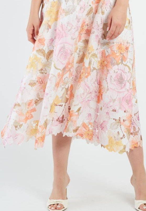 フラワーモチーフのレース地と淡い暖色カラーが絶妙な美ワンピース。